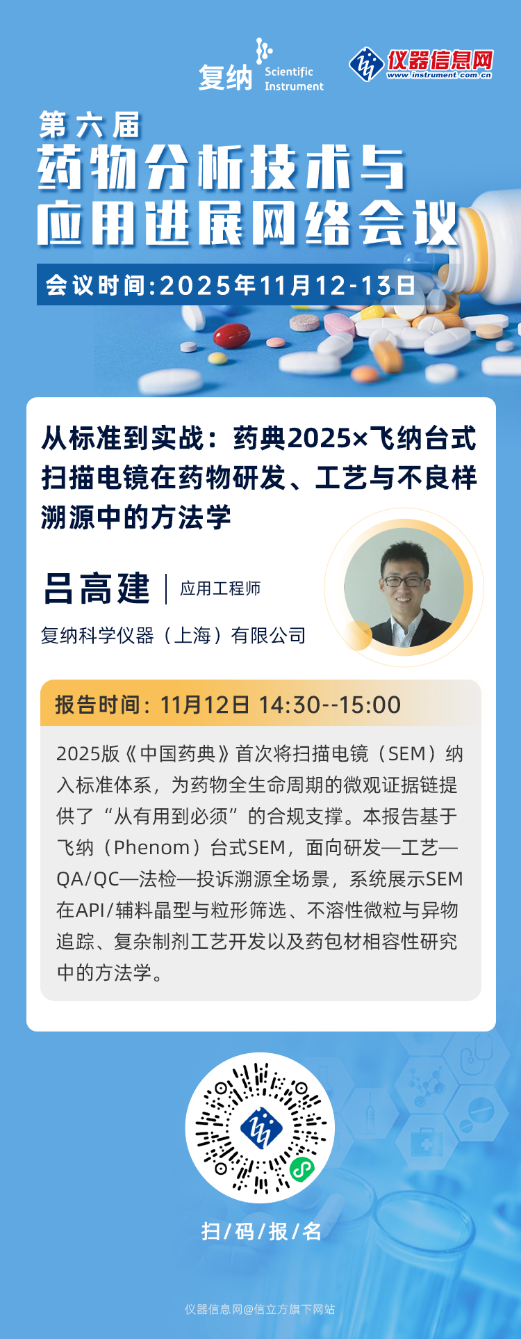 复纳科学仪器(上海)有限公司应用工程师吕高建将带来主题【从标准到实战:药典2025x飞纳台式扫描电镜在药物研发、工艺与不良样湖源中的方法学】,报告时间为 11月12日 14:30-15:00,欢迎报名预约观看。
