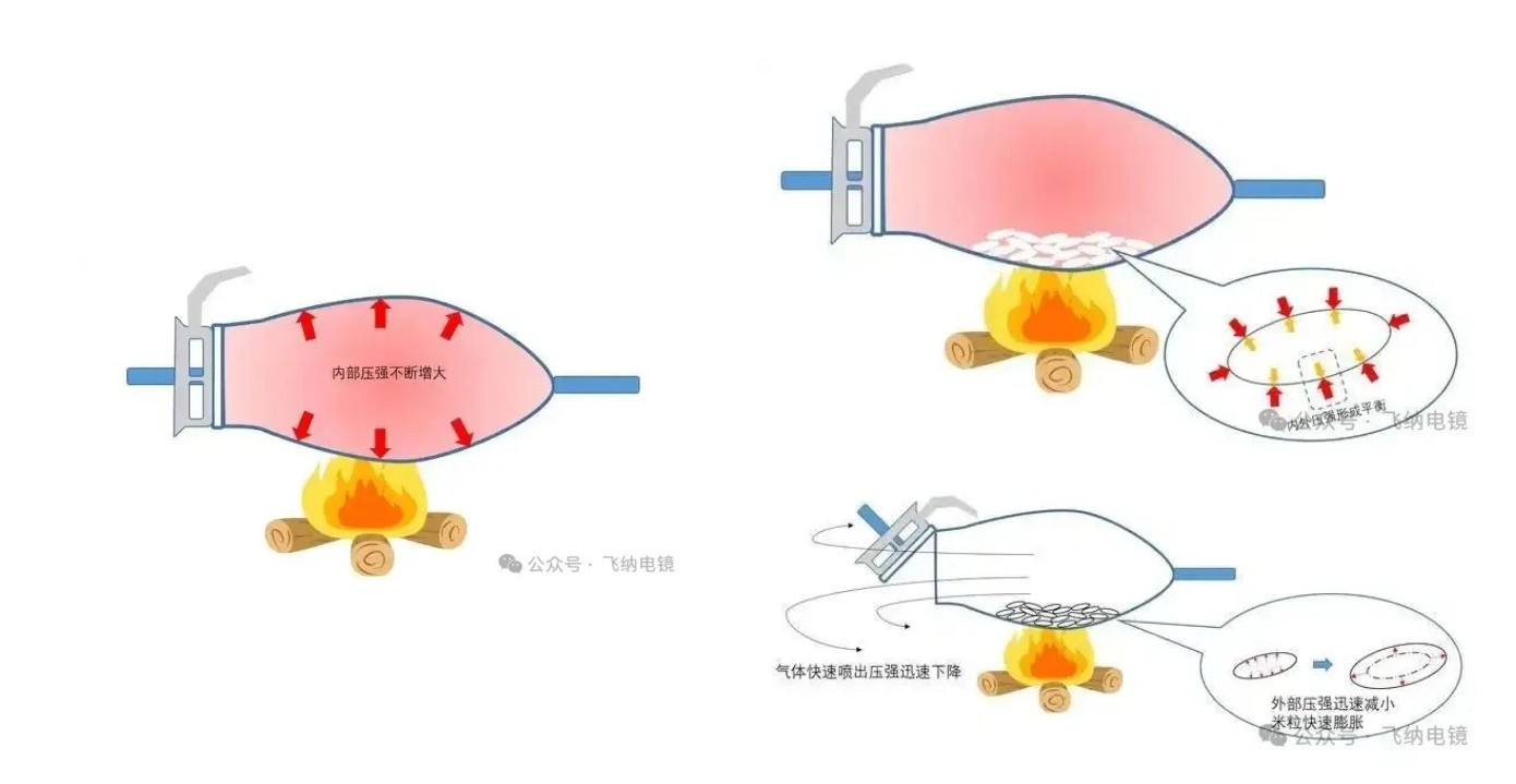 玉米粒的外壳像天然的“高压容器”。加热到180°C时,内部水分蒸发并积聚高压,最终冲破外壳,糊化的淀粉瞬间膨胀并冷却成蓬松的白色结构。爆米花内部错综复杂的空腔和纤维状淀粉网络,这正是它蓬松口感的来源。