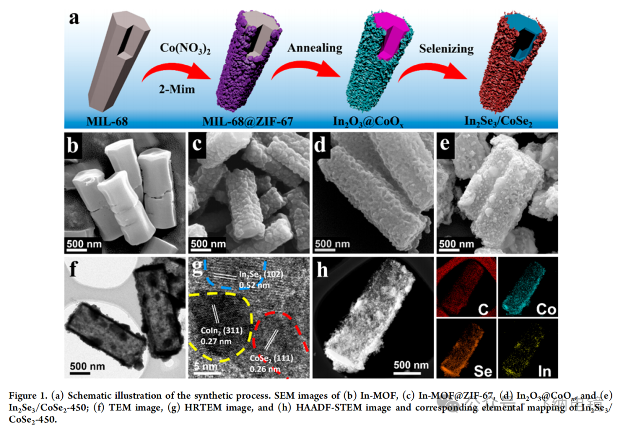 这篇文章的核心内容是通过构建 InSe-CoIn-CoSe 异质结,实现了高倍率可逆钠存储。研究人员通过在铟基 MOFs(MIL-68)表面生长钴基 MOFs(ZIF-67),然后通过原位气相硒化,制备了具有双界面的 InSe-CoIn-CoSe 异质结。这种结构不仅提高了材料的电导率和钠离子扩散速率,还增强了结构稳定性,从而显著提升了钠离子电池的性能。通过飞纳台式场发射扫描电子显微镜(Phenom Pharos)的表征,研究人员详细观察了 InSe/CoSe-450 样品的形貌和结构变化。这种基于 MOFs 的异质结材料在钠离子电池中展现出优异的性能,为高性能钠离子电池负极材料的设计提供了新的思路。
