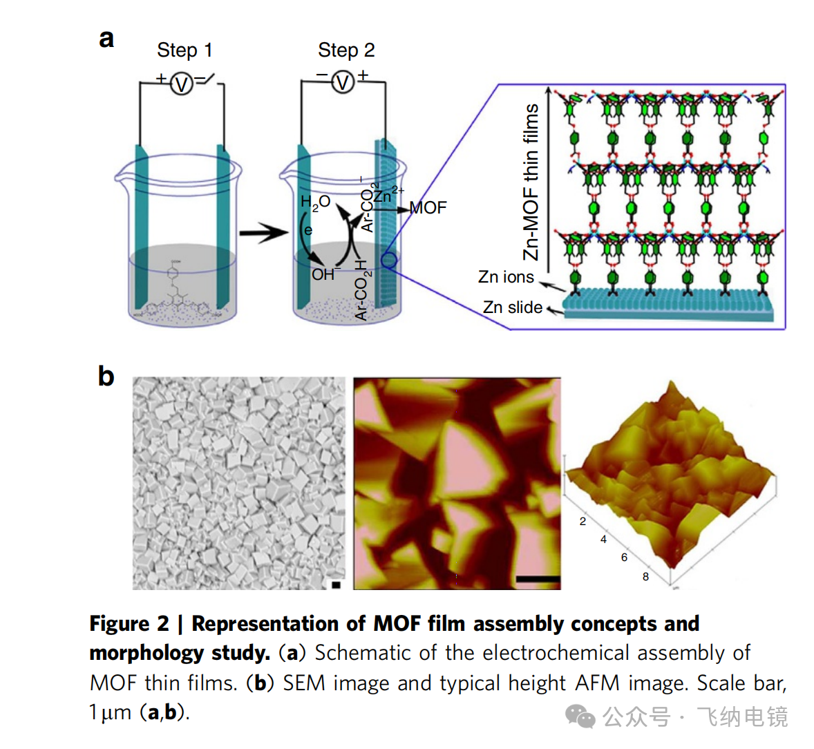 这篇文章的核心内容是将多孔金属-有机框架(MOFs)集成到导电金属板阳极的表面,通过原位温度控制的电化学组装方法沉积形成互穿、结晶的 MOFs 薄膜。这种薄膜不仅具有良好的电介质性能,而且其表面形貌、厚度和均匀性都可以通过控制反应条件(如温度、时间和电压)来精确调控。研究结果表明,这种 MOFs 薄膜的介电常数比传统的无机或有机栅极电介质材料高出许多,这为 MOFs 在电子设备中的应用提供了新的可能性。研究人员使用了飞纳扫描电子显微镜(Phenom G2)来观察 MOFs 薄膜的表面形貌和微观结构,并通过调整反应条件实现了对薄膜厚度和表面形貌的精确控制。