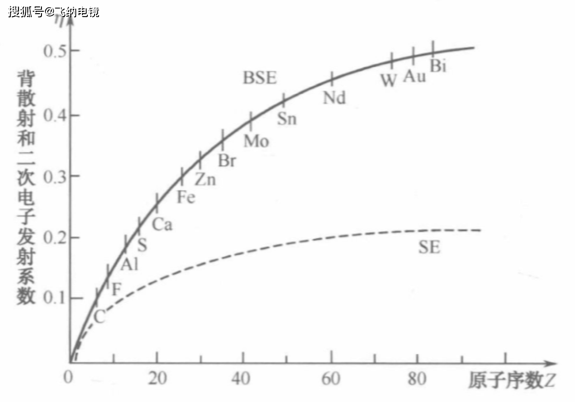 在一定的加速电压下,背散射电子的产生量随着样品原子序数的增高而增加,其增加量比二次电子要敏感许多,如下图所示。所以,背散射电子不仅可以用于形貌分析,还可以用于显示样品化学组分的组成特征,在一定范围内对试样表面粗略地进行化学成分分布情况分析。