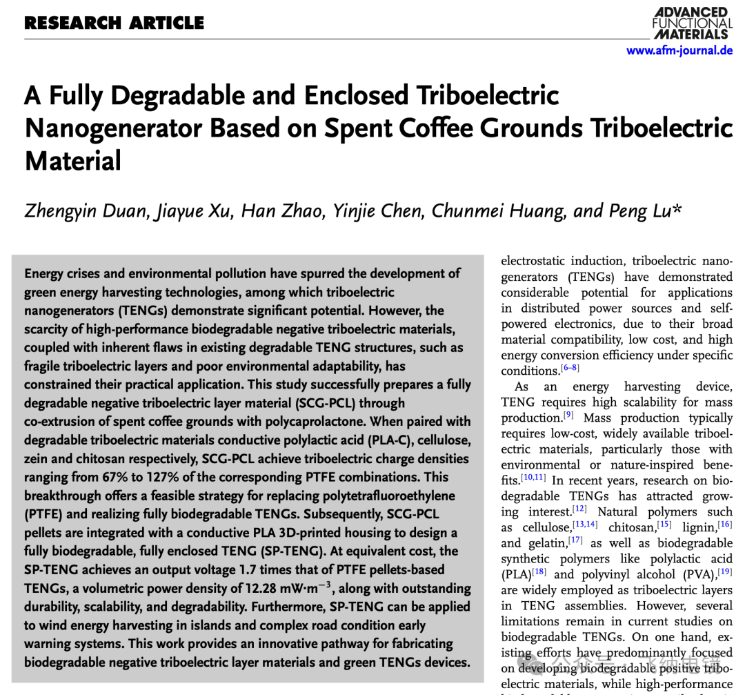 这项研究实现了从废弃物到能源材料的绿色闭环:废弃咖啡渣 → 高性能发电材料;可降解结构 → 环境友好无污染;飞纳电镜 → 揭示微观机制;应用验证 → 绿色自供电系统。这不仅是一项材料创新,更是一种可持续科研的典范。