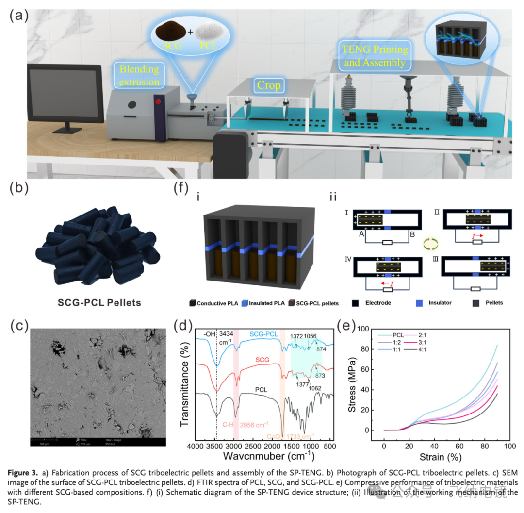 研究人员将咖啡渣与可降解高分子聚己内酯(PCL)共挤出,制备出 SCG-PCL 复合颗粒。咖啡渣富含木质素、纤维素、脂肪酸等成分,表面粗糙、含有大量负电性官能团(羟基、羧基),显著提升摩擦起电能力。