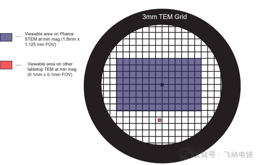 得益于 SEM 的大视野和快速扫描能力,您可以迅速对载网上的多个网格孔进行低倍预览,快速定位理想区域。然后进行高倍下的精细观察,大大提升了筛选效率和成功率。如下图所示,在最小分辨率下,Pharos STEM 的视野大小是传统 TEM 的 200 倍。
