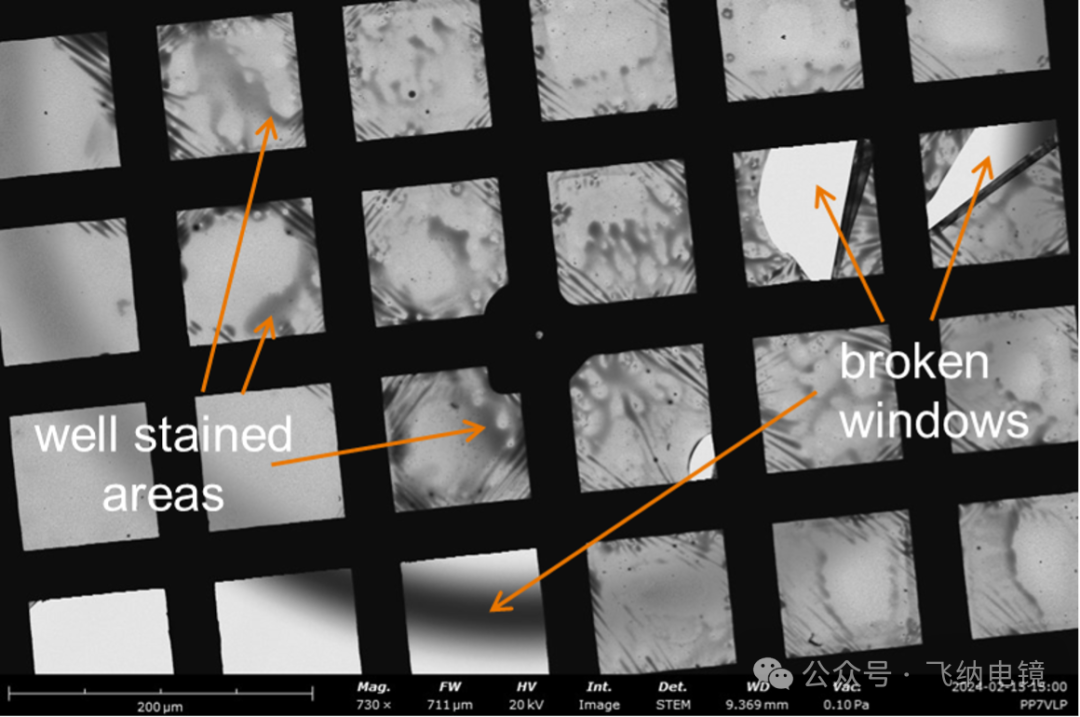 下图为 Pharos STEM 的低放大倍数图片,可观察到的负染色样品的网格窗口情况,染色的分布和浓度。