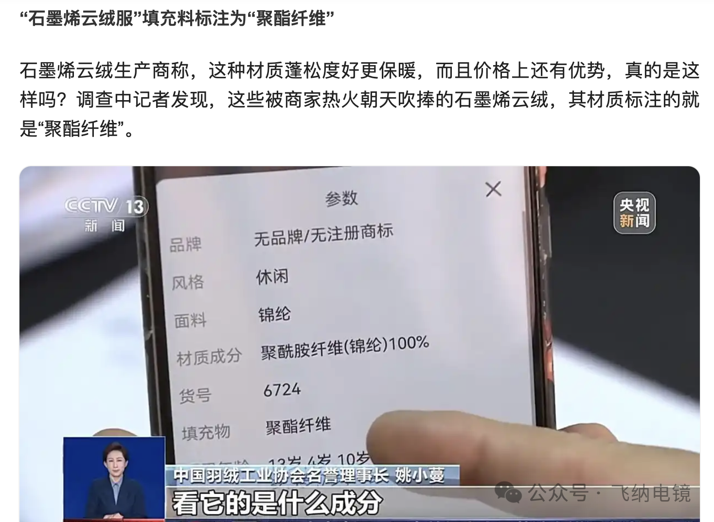 近日新华网发布调查报道指出:不少标注为“石墨烯云绒棉”的服装,填充成分实际为聚酯纤维,产品宣传中对石墨烯添加量、检测报告等关键信息语焉不详,仅强调“保暖媲美羽绒”“自发热”等模糊表述。